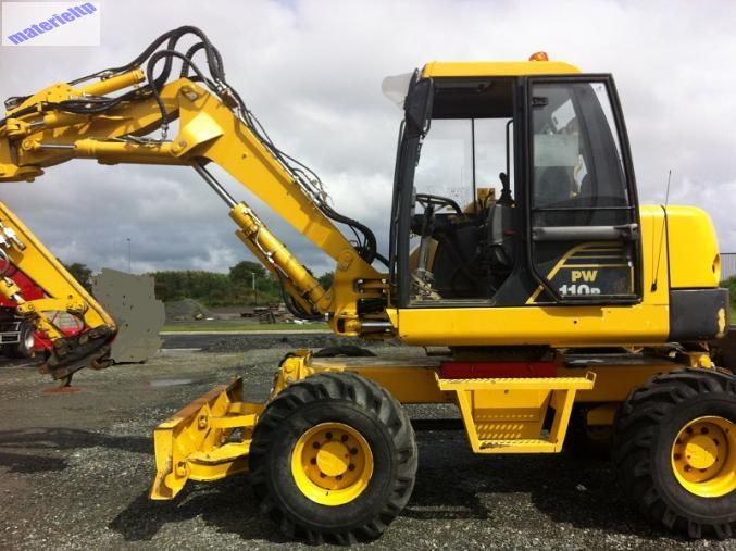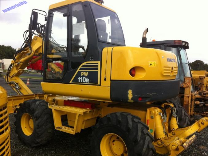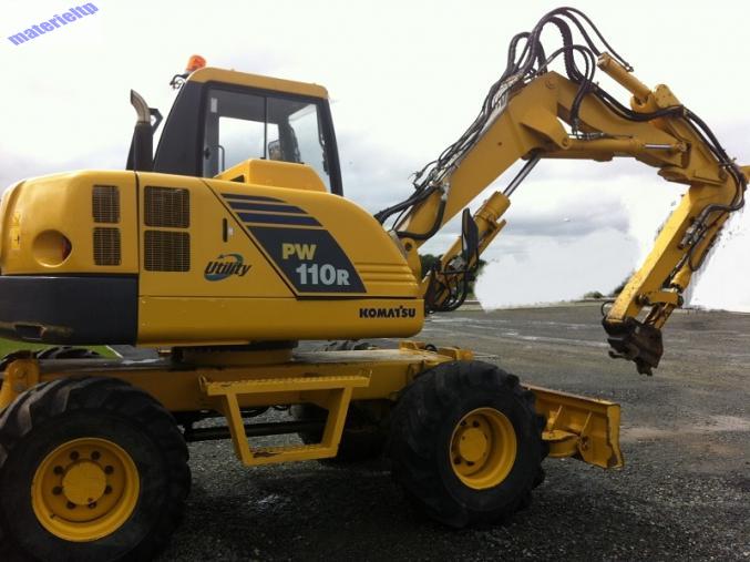 pelle sur pneus d'occasion komatsu pw110r année 2011 5000 heures déport sur flèche et déport pied de flèche lame stabilisateurs clapets de sécurité lignes auxiliaires coupeur geith 4 godets