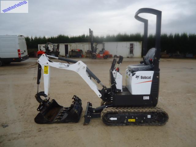 Micro pelle 1138 kgs Bobcat E08 45 heures de marche Rayon court, voies variables avec élargisseur de lame, 3 godets, lignes hydrauliques, déport pied de flèche, arceau repliable, éclairage Me contacter