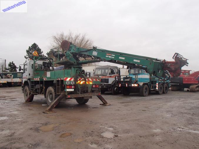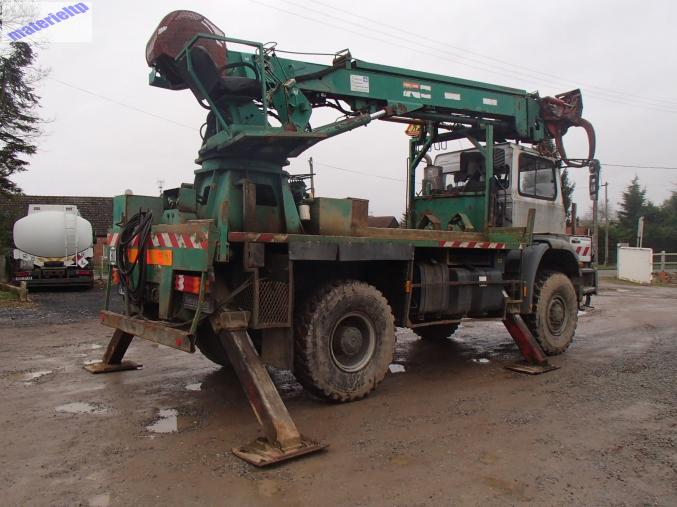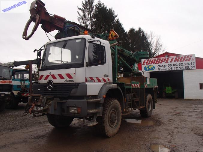 Camion d'occasion, MERCEDES ATEGO 1828 TRAVAUX, du 03/08/2004, de 203000km, 4X4, Bicarburation, Prises AR Hydraulique, Treuil AV Hydraulique, Carrosserie LEVE POTEAUX GRUE FOREUSE, HEP C160 de 1985, 4 Stabilisateurs, Tarriére, Pince, Treuil avec crochet, Apave au 02/2014, Mines au 01/09/2015, Bloquage des Ponts et Inter-pont,