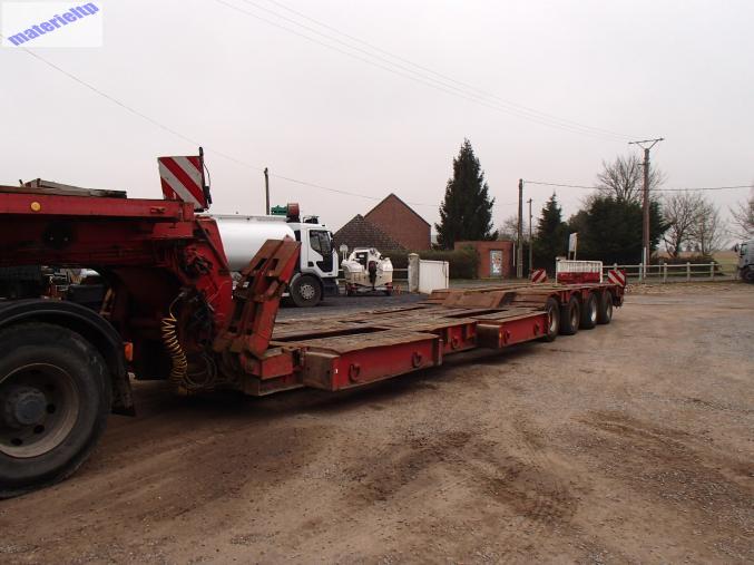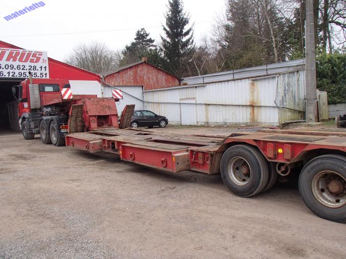 Semi-remorque d' occasion Porte Engin, TRAX, du 04/05/1994, PV:18T00, PTAC: 34T00 à 65T00, CU: 16T00 à 47T00,4 Essieux SAE, Roues Jumelées en 9,5R17,5 ; 2 Essieux AR AUTO-SUIVEURS; Plateau Central de 6,60mx2,50m à 0,55m du sol; Col de Cygne de 2,20mx2,40m à 1,90m du sol, Plateau AR de 5,70mx2,50m à 0,85m du sol;Mines au 30/05/2015,